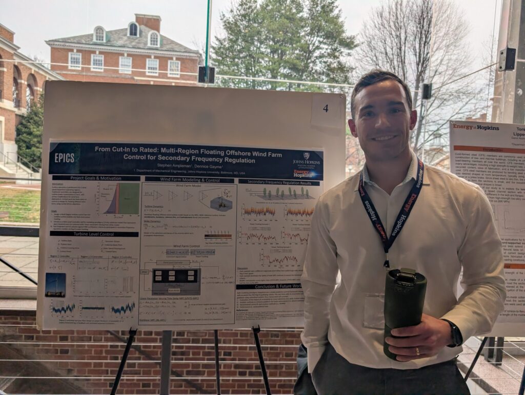 ARROW student Stephen Ampleman, working with ARROW faculty Dennice Gayme, presents the poster From Cut-In to Rated: Multi-Region Floating Offshore Wind Farm Control for Secondary Frequency Regulation at the Ralph O’Connor Sustainable Energy Institute (ROSEI) summit at Johns Hopkins University last month.